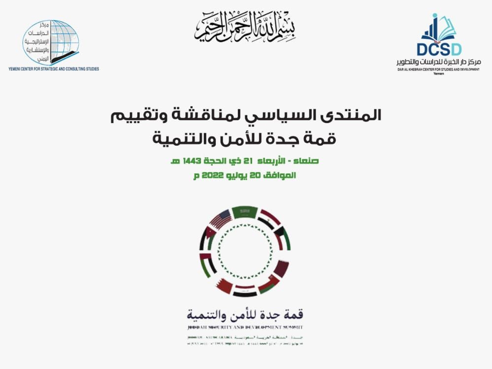 وكان قد استعرض الاخ نائب رئيس مركز دار الخبرة للدراسات والتطوير الدكتور أحمد العماد والمدير التنفيذي للمركز العميد الركن ابراهيم اللوزي في مستهل افتتاح الندوة اهمية المنتدى لتقييم قمة جدة ودوره في تقييم الأحداث في المنطقة وتاثيراتها على اليمن والعالم.