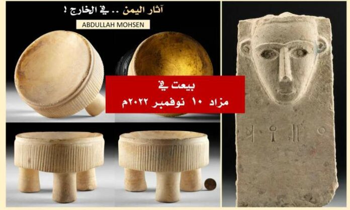 وقال الناشطون الذين نشروا صورا للاثار انه تم بيع شاهد جنائزمن الحجر الجيري من اثاراليمن ، منحوت بدقة ، برأس بارزة فوق نقش مسندي مكون من أربعة أحرف تقرأ بمزاد للآثار الاستثنائية من الفنون الإثنوغرافية الجميلة بمعرض ارتميس للمزادات في الولايات المتحدة يوم الخميس العاشر من نوفمبر 2022م
