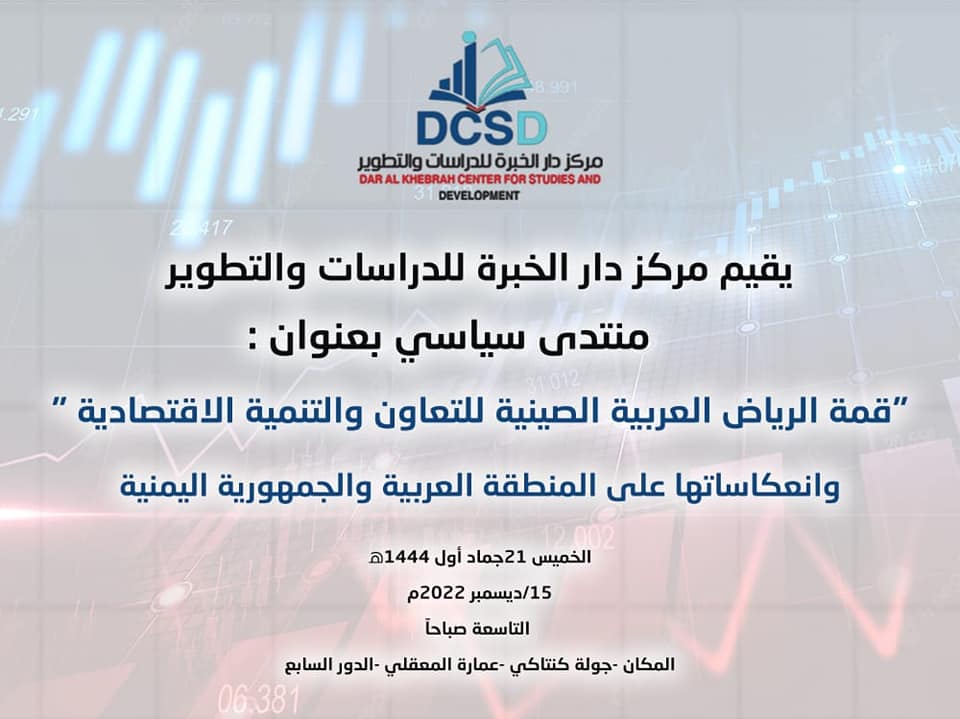 نظم مركز دار الخبرة للدراسات والتطوير اليوم بصنعاء منتدى سياسي حول قمة الرياض العربية الصينية , بمشاركة عدد من الاكاديميين والخبراء السياسيين من وزارة الخارجية والجامعات اليمنية.