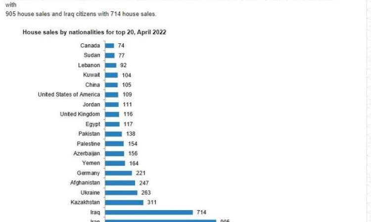 وأوضحت وثائقُ مركَز الإحصاء التركي أن شراءَ البيوت في تركيا من قبل اليمنيين في القائمة 8 لشهر أبريل 2022 بعدد 164 منزلاً، وفي ذات القائمة لشهر فبراير من ذات العام بعدد 141 منزلاً، و152 منزلاً في شهر مارس، و222 منزلاً لشهر يونيو في المرتبة التاسعة.