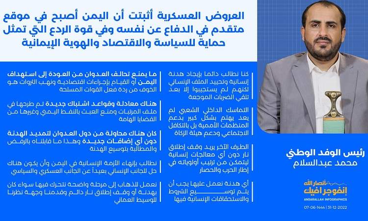 وبخصوص دور القوات المسلحة في توازن الردع والدفع قدما في المفاوضات اشار عبدالسلام الى ان ما يمنع تحالف العدوان من العودة إلى استهداف اليمن أو القيام بإجراءات اقتصادية ونهب الثروات هو الخوف من ردة فعل القوات المسلحة