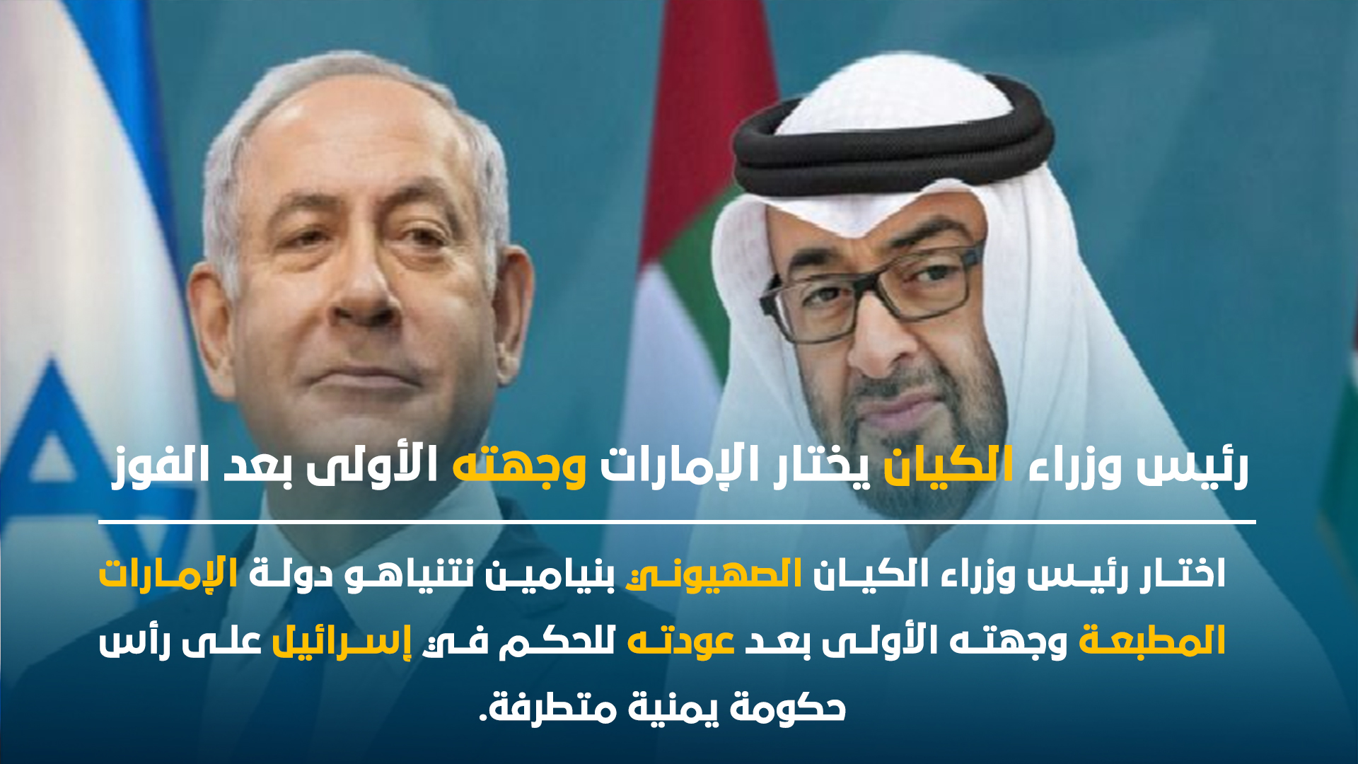 اختار رئيس وزراء الكيان الصهيوني بنيامين نتنياهو دولة الإمارات المطبعة وجهته الأولى بعد عودته للحكم في إسرائيل على رأس حكومة يمنية متطرفة.