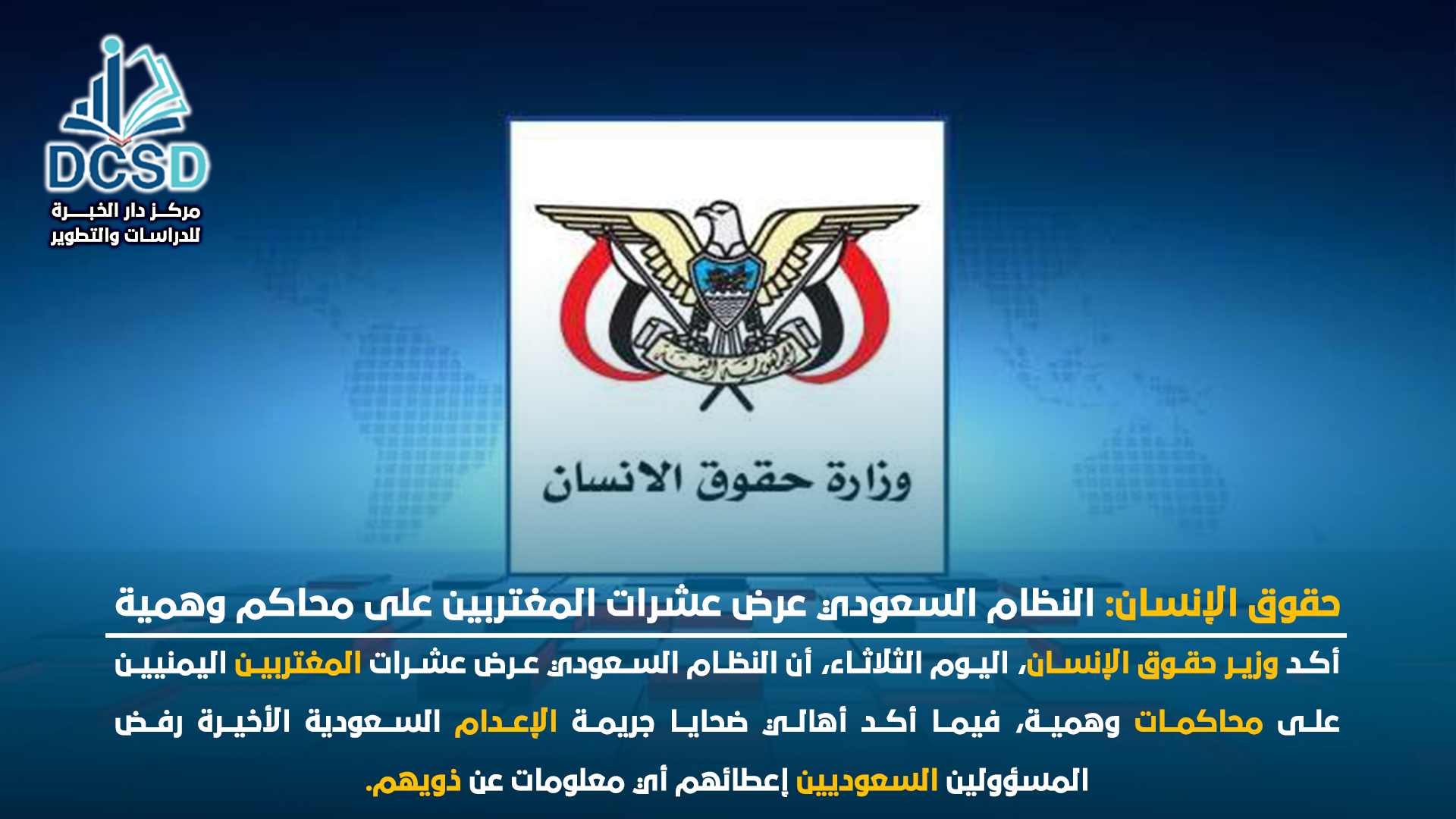 أكد وزير حقوق الإنسان، اليوم الثلاثاء، أن النظام السعودي عرض عشرات المغتربين اليمنيين على محاكمات وهمية، فيما أكد أهالي ضحايا جريمة الإعدام السعودية الأخيرة رفض المسؤولين السعوديين إعطائهم أي معلومات عن ذويهم.