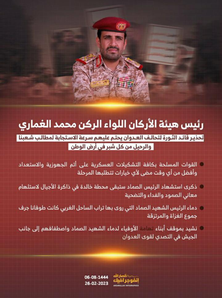 أكد رئيس هيئة الأركان اللواء الركن محمد الغماري، أن تحذير قائد الثورة لتحالف العدوان يحتّم عليهم سرعة الاستجابة لمطالب شعبنا والرحيل من كل شبر في أرض الوطن.