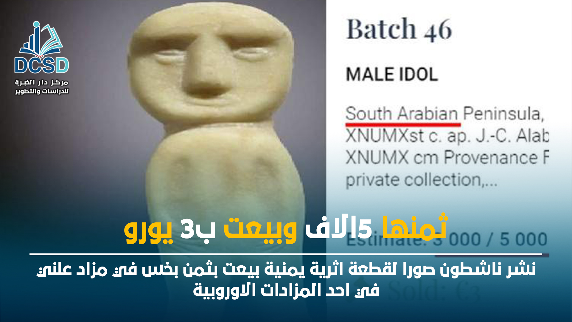 وقال الناشط والخبير في مجال الاثار عبدالله محسن في صفحته على الفيسبوك ان قطعة من أثار_اليمن تحتوي نقشا مسنديا ، عرضت في أحد المزادات الأوربية ، قدر خبراء المزاد قيمتها بخمسة آلاف يورو ، لكنها بيعت بثلاثة يورو فقط.