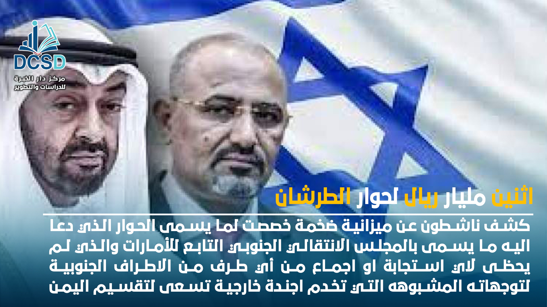 كشف ناشطون عن ميزانية ضخمة خصصت لما يسمى الحوار الذي دعا اليه ما يسمى بالمجلس الانتقالي الجنوبي التابع للأمارات والذي لم يحظى لاي استجابة او اجماع من أي طرف من الاطراف الجنوبية لتوجهاته المشبوهه التي تخدم اجندة خارجية تسعى لتقسيم اليمن ونهب ثرواته والاستيلاء على مقدراته.
