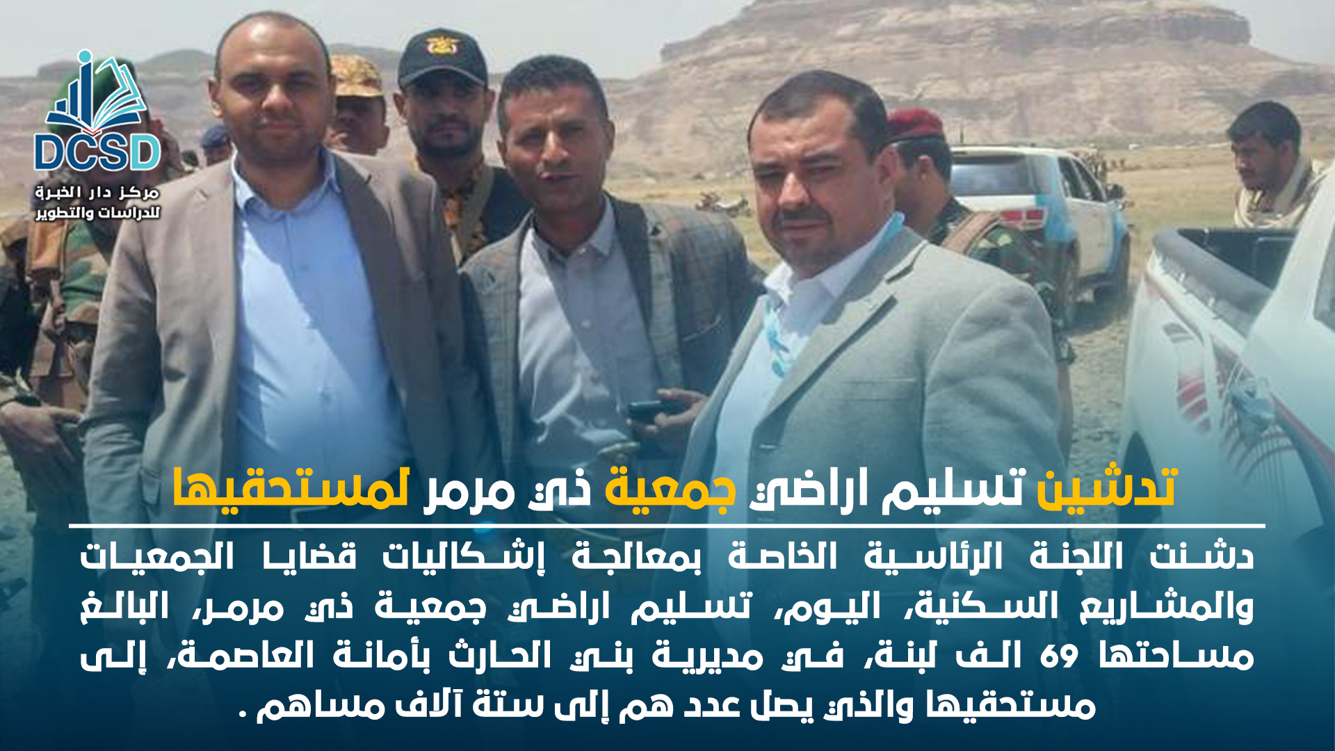 دشنت اللجنة الرئاسية الخاصة بمعالجة إشكاليات قضايا الجمعيات والمشاريع السكنية، اليوم، تسليم اراضي جمعية ذي مرمر، البالغ مساحتها 69 الف لبنة، في مديرية بني الحارث بأمانة العاصمة، إلى مستحقيها والذي يصل عدد هم إلى ستة آلاف مساهم .